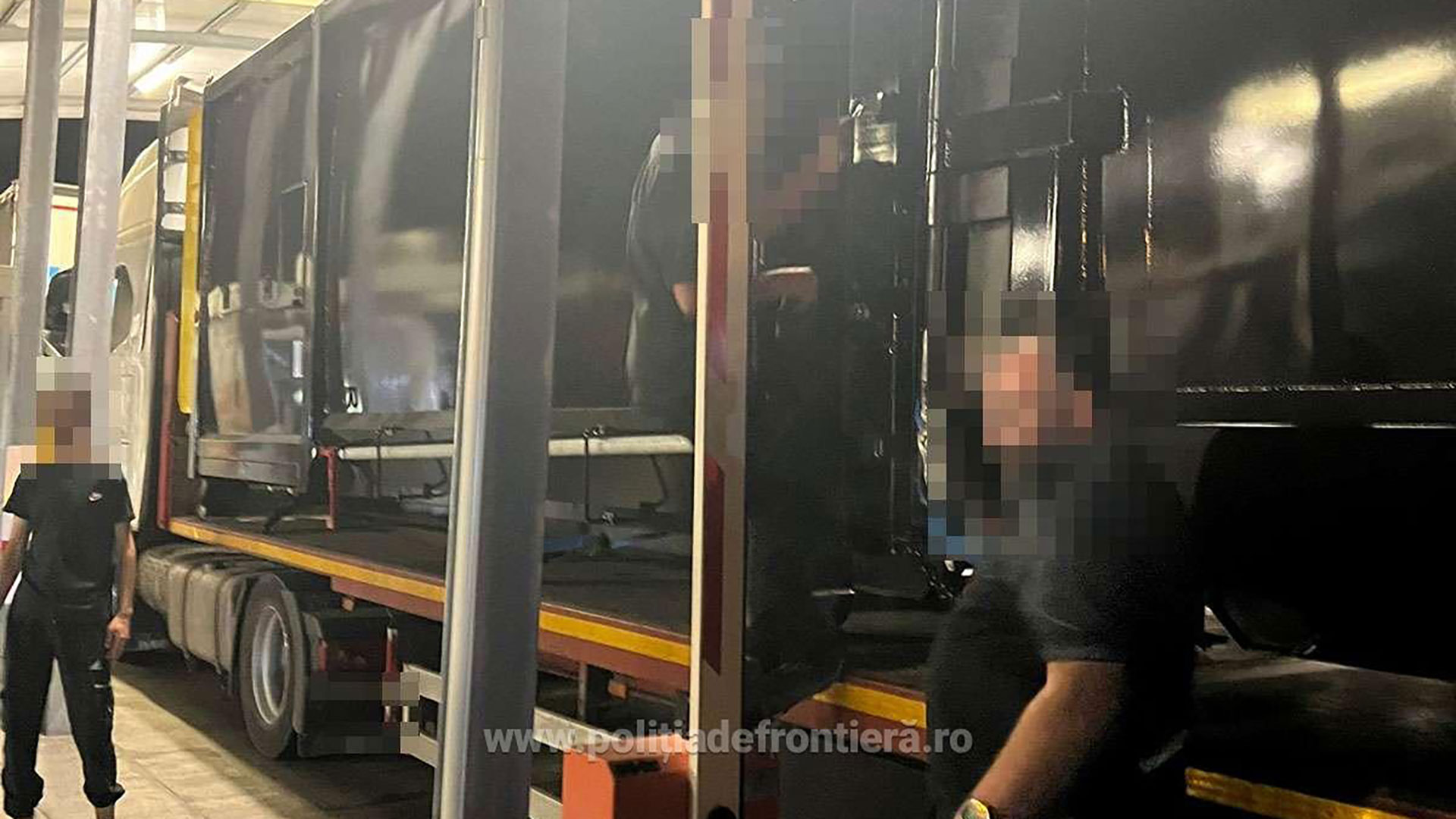 În urma efectuării controlului amănunţit al mijlocului de transport, au fost descoperiţi, ascunşi în unul din cele două containere, nouă cetăţeni străini.